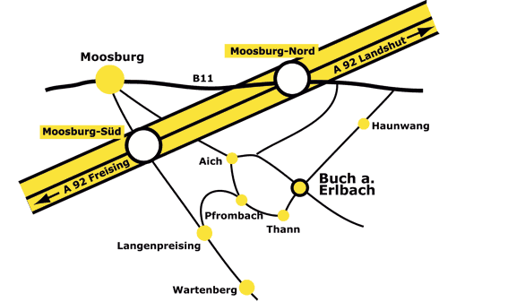 Über die A 92 München-Deggendorf, Abfahrt Buch am Erlbach.